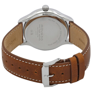 Silver-tone stainless steel case with a brown leather strap. Fixed silver-tone stainless steel bezel. Blue dial with silver-tone hands and index hour markers. Minute markers around the outer rim. Dial Type: Analog. Luminescent hands and markers. Date display at the 3 o'clock position. Quartz movement. Round case shape, case size: 40 mm. Tang clasp. Functions: date, hour, minute, second. Heritage Series. Casual watch style. Watch label: Swiss Made. Movado Heritage Quartz Blue Dial Men's Watch 3650155.