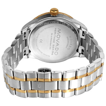 Stainless steel case with a two-tone (silver-tone and yellow gold ion-plated) stainless steel bracelet. Uni-directional rotating yellow gold ioin-plated bezel with an inlaid green aluminium ring. Green dial with luminous black hands and dot hour markers. Minute markers around the outer rim. Dial Type: Analog. Luminescent hands and markers. Date display at the 3 o'clock position. Quartz movement. Scratch resistant sapphire crystal. Pull / push crown. Solid case back. Round case shape. Case size: 43 mm. Deployment clasp with a push button release. Water resistant at 50 meters / 165 feet. Functions: date, hour, minute, second. Heritage Series. Casual watch style. Movado Heritage Quartz Green Dial Men's Watch 3650096.