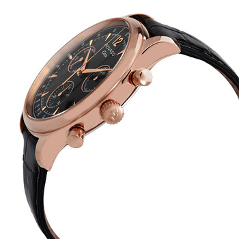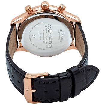 Rose gold ion-plated stainless steel case with a black leather strap. Fixed rose gold ion-plated bezel. Black dial with rose gold-tone hands and index hour markers. Arabic numeral appears at the 12 o'clock position. Minute markers. Tachymeter markings around the outer rim. Dial Type: Analog. Date display between the 4 and 5 o'clock positions. Chronograph - two sub-dials displaying: 60 second and 30 minute. Day of the week sub-dial. Quartz movement. Scratch resistant sapphire crystal. Pull / push crown. Solid case back. Round case shape. Case size: 43 mm. Tang clasp. Water resistant at 30 meters / 100 feet. Functions: chronograph, date, hour, minute, second. Heritage Series Circa Series. Casual watch style. Movado Heritage Series Circa Chronograph Quartz Black Dial Men's Watch 3650109.
