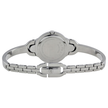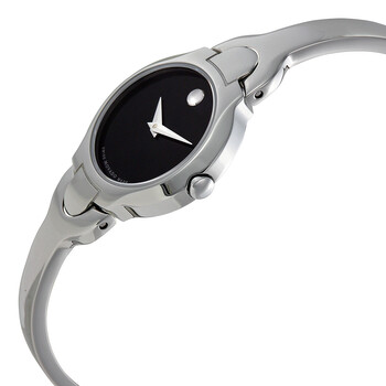 Stainless steel case with a stainless steel bracelet. Fixed stainless steel bezel. Black dial with silver-tone hands. No markers. The signature Movado dot appears at the 12 o'clock position. Dial Type: Analog. Quartz movement. Scratch resistant sapphire crystal. Pull / push crown. Solid case back. Case diameter: 24 mm. Case thickness: 6 mm. Round case shape. Bracelet width: 5 mm. Jewelry clasp. Water resistant at 30 meters / 100 feet. Functions: hour, minute. Dress watch style. Watch label: Swiss Made. Movado Kara Black Dial Stainless Steel Ladies Watch 0605247.