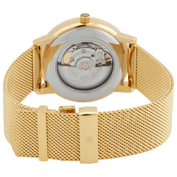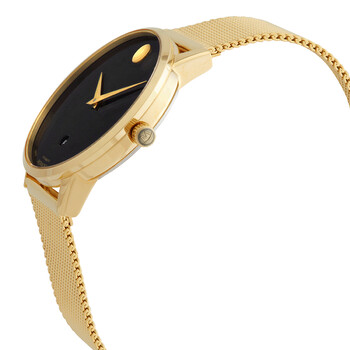 Yellow gold-tone stainless steel case with a yellow gold-tone stainless steel mesh bracelet. Fixed yellow gold-tone stainless steel bezel. Black museum dial with yellow gold-tone hands. Dial Type: Analog. Date display at the 6 o'clock position. Automatic movement. Scratch resistant sapphire crystal. Transparent see through case back. Round case shape, case size: 40 mm. Deployment with push button release clasp. Water resistant at 30 meters / 100 feet. Functions: date, hour, minute, second. Museum Classic Series. Casual watch style. Watch label: Swiss Made. Movado Museum Classic Automatic Men's Watch 0607632.