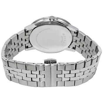 Stainless steel case with a stainless steel bracelet. Fixed stainless steel bezel. Black dial with silver-tone hands and diamond hour markers. The Movado dot appears at the 12 o'clock position. Dial Type: Analog. Quartz movement. Scratch resistant sapphire crystal. Pull / push crown. Solid case back. Round case shape. Case size: 40 mm. Band width: 21 mm. Deployment clasp with a push button release. Water resistant at 30 meters / 100 feet. Functions: hour, minute. Additional Info: dial set with 11 diamond markers (0.043 t.c.w.). Casual watch style. Watch label: Swiss Made. Movado Museum Classic Black Dial Men's Watch 0607201.