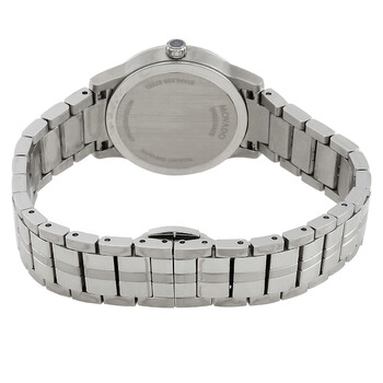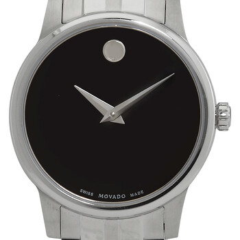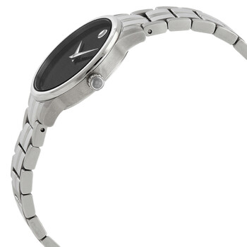 Silver-tone stainless steel case and bracelet. Fixed silver-tone stainless steel bezel. Black dial with silver-tone hands. No markers. Movado dot appears at the 12 o'clock position. Dial Type: Analog. Quartz movement. Scratch resistant sapphire crystal. Pull / push crown. Solid case back. Round case shape, case size: 28 mm. Deployment clasp. Water resistant at 30 meters / 100 feet. Functions: hour, minute. Museum Classic Series. Dress watch style. Watch label: Swiss Made. Movado Museum Classic Quartz Black Dial Ladies Watch 0607537.