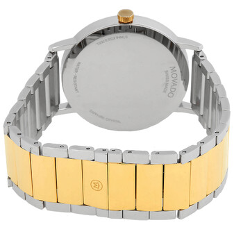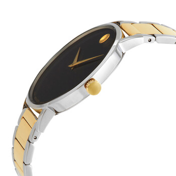 Silver-tone stainless steel case with a two-tone (silver-tone and gold-tone) stainless steel bracelet. Fixed silver-tone stainless steel bezel. Black dial with gold-tone hands. No markers. Movardo dot appears at the 12 o'clock position. Dial Type: Analog. Quartz movement. Scratch resistant sapphire crystal. Pull / push crown. Solid case back. Round case shape, case size: 40 mm. Fold over clasp with a push button release. Water resistant at 30 meters / 100 feet. Functions: hour, minute. Museum Classic Series. Dress watch style. Watch label: Swiss Made. Movado Museum Classic Quartz Black Dial Men's Watch 0607217.