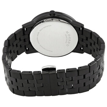 Black stainless steel case and bracelet. Fixed black stainless steel bezel. Black dial with gold-tone hands. Dial Type: Analog. Quartz movement. Scratch resistant sapphire crystal. Solid case back. Round case shape, case size: 40 mm. Deployment with push button release clasp. Water resistant at 30 meters / 100 feet. Functions: hour, minute. Museum Classic Series. Casual watch style. Watch label: Swiss Made. Movado Museum Classic Quartz Black Dial Men's Watch 0607626.