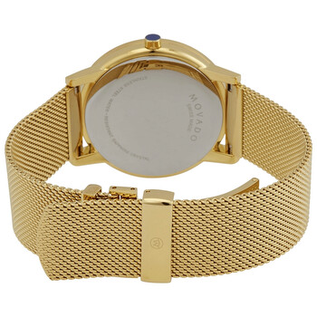 Yellow gold PVD stainless steel case with a yellow gold PVD stainless steel mesh bracelet. Fixed yellow gold PVD bezel. Black dial with yellow gold-tone hands. No markers. The Movado dot appears at the 12 o'clock position. Dial Type: Analog. Quartz movement. Scratch resistant sapphire crystal. Pull / push crown. Solid case back. Round case shape. Case size: 40 mm. Case thickness: 7 mm. Band width: 21 mm. Fold over clasp with a push button release. Water resistant at 30 meters / 100 feet. Functions: hour, minute. Museum Classic Series. Casual watch style. Watch label: Swiss Made. Movado Museum Classic Quartz Black Dial Watch 0607396.