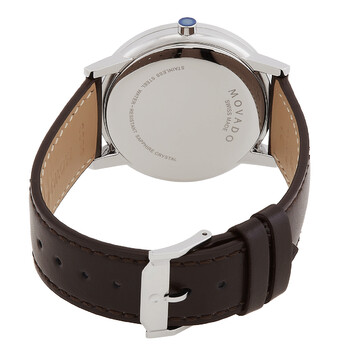 Silver-tone stainless steel case with a brown leather strap. Fixed silver-tone stainless steel bezel. Blue dial with silver-tone hands. Dot motif at 12 o’clock position. Dial Type: Analog. Quartz movement. Scratch resistant sapphire crystal. Pull / push crown. Solid case back. Round case shape, case size: 40 mm. Buckle clasp. Water resistant at 30 meters / 100 feet. Functions: hour, minute. Museum Series. Casual watch style. Watch label: Swiss Made. Movado Museum Classic Quartz Blue Dial Unisex Watch 0607851.