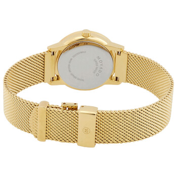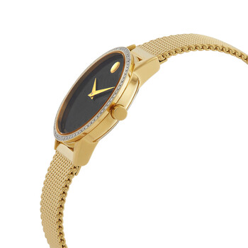 Yellow gold-tone stainless steel case and bracelet. Fixed yellow gold-tone bezel with diamond set stainless steel. Black dial with yellow gold-tone hands. Dial Type: Analog. Quartz movement. Round case shape, case size: 28 mm. Fold over clasp. Functions: hour, minute. Museum Classic Series. Casual watch style. Watch label: Swiss Made. Movado Museum Classic Quartz Diamond Black Dial Ladies Watch 0607606.