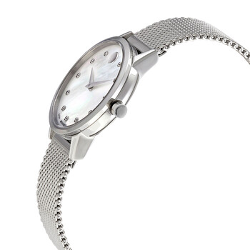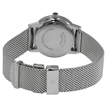 Stainless steel case with a stainless steel mesh bracelet. Fixed stainless steel bezel. White mother of pearl dial with silver-tone hands and diamond hour markers. The Movado dot appears at the 12 o'clock positions. Dial Type: Analog. Quartz movement. Scratch resistant sapphire crystal. Pull / push crown. Solid case back. Round case shape. Case size: 28 mm. Band width: 15 mm. Fold over slip through clasp. Water resistant at 30 meters / 100 feet. Functions: hour, minute. Additional Info: dial set with 11 diamonds (0.043 cts). Museum Classic Series. Dress watch style. Watch label: Swiss Made. Movado Museum Classic Quartz Diamond White Mother of Pearl Dial Ladies Watch 0607491.