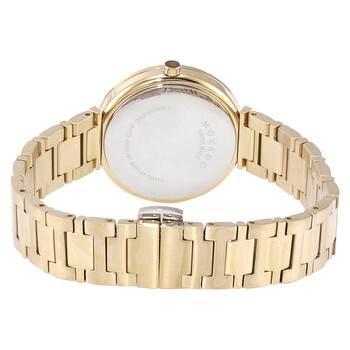 Light yellow gold PVD stainless steel case and bracelet. Fixed light yellow gold PVD bezel. White dial with yellow gold-tone hands. No markers. The Movado dot appears at the 12 o'clock position. Dial Type: Analog. Quartz movement. Scratch resistant sapphire crystal. Pull / push crown. Solid case back. Round case shape. Case size: 32 mm. Deployment clasp. Water resistant at 30 meters / 100 feet. Functions: hour, minute. Museum Classic Series. Dress watch style. Watch label: Swiss Made. Movado Museum Classic Quartz White Dial Ladies Watch 0607519.