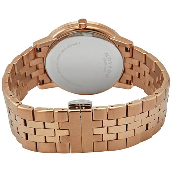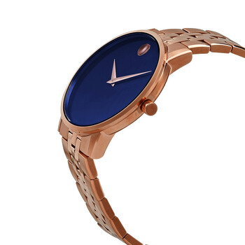Rose gold PVD stainless steel case and bracelet. Fixed rose gold PVD bezel. Blue dial with rose gold-tone hands. No markers. The Movado dot appears at the 12 o'clock position. Dial Type: Analog. Quartz movement. Scratch resistant sapphire crystal. Pull / push crown. Solid case back. Round case shape. Case size: 40 mm. Band width: 22 mm. Fold over clasp with a push button release. Water resistant at 30 meters / 100 feet. Functions: hour, minute. Museum Series. Casual watch style. Watch label: Swiss Movt. Movado Museum Quartz Blue Dial Men's Watch 0607353.