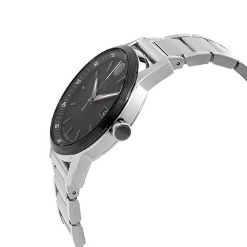 Stainless steel case with a stainless steel bracelet. Fixed black PVD bezel. Black dial with luminous black hands and index hour markers. Arabic numeral minute markers (at 5 minute intervals). Minute markers around the outer rim. The Movado dot appears at the 12 o'clock position. Dial Type: Analog. Luminescent hands. Date display at the 3 o'clock position. Quartz movement. Scratch resistant sapphire crystal. Pull / push crown. Solid case back. Round case shape. Case size: 42 mm. Case thickness: 10 mm. Band width: 21 mm. Deployment clasp. Water resistant at 30 meters / 100 feet. Functions: date, day, hour, minute, second. Museum Sport Series. Casual watch style. Watch label: Swiss Made. Movado Museum Sport Quartz Black Dial Men's Watch 0607557.