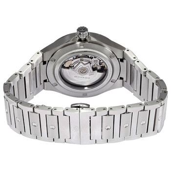 Stainless steel case with a stainless steel bracelet. Fixed stainless steel bezel. Black dial with luminous silver-tone hands and index hour markers. The Movado dot appears at the 12 o'clock position. Dial Type: Analog. Luminescent hands and markers. Date display at the 3 o'clock position. Movado calibre 608A automatic movement. Scratch resistant sapphire crystal. Screw down crown. Transparent case back. Round case shape. Case size: 41 mm. Case thickness: 11.5 mm. Fold over clasp. Water resistant at 100 meters / 330 feet. Functions: date, hour, minute, second. Se Automatic Series. Casual watch style. Watch label: Swiss Made. Movado SE Automatic Black Dial Men's Watch 0607551.