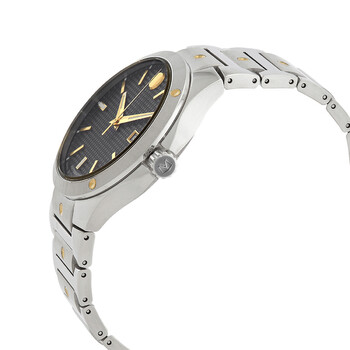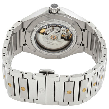 Stainless steel case with a stainless steel bracelet set with gold-tone PVD dots. Fixed stainless steel bezel set with gold-tone PVD dots. Grey paves de paris dial with luminous gold-tone hands and index hour markers. Minute markers around the outer rim. Movado dot appears at the 12 o'clock position. Dial Type: Analog. Luminescent hands and markers. Date display at the 3 o'clock position. Caliber 608A automatic movement with a 38-hour power reserve. Scratch resistant sapphire crystal. Screw down crown. Transparent case back. Round case shape. Case size: 41 mm. Band width: 15 mm. Deployment clasp. Water resistant at 100 meters / 330 feet. Functions: date, hour, minute, second. Se Automatic Series. Dress watch style. Watch label: Swiss Made. Movado SE Automatic Grey Paves de Paris Dial Men's Watch 0607552.