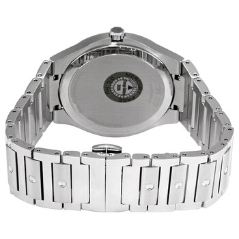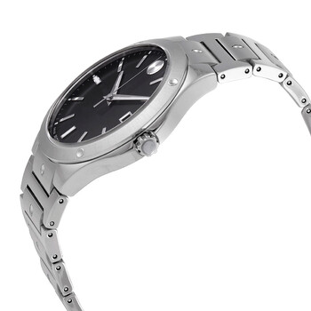 Stainless steel case with a stainless steel bracelet. Fixed stainless steel bezel. Black dial with luminous silver-tone hands and index hour markers. Minute markers around the outer rim. The Movado dot appears at the 12 o'clock position. Dial Type: Analog. Luminescent hands and markers. Date display at the 3 o'clock position. Quartz movement. Scratch resistant sapphire crystal. Pull / push crown. Solid case back. Round case shape. Case size: 41 mm. Band width: 21 mm. Fold over clasp with a push button release. Water resistant at 50 meters / 165 feet. Functions: date, hour, minute, second. Se Series. Dress watch style. Watch label: Swiss Made. Movado SE Quartz Black Dial Unisex Watch 0607541.