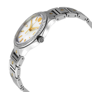 Stainless steel case with a stainless steel bracelet. Fixed stainless steel bezel set with diamonds. Mother of pearl dial with luminous yellow gold-tone hands and index hour markers. Minute markers around the outer rim. The Movado dot appears at the 12 o'clock position. Dial Type: Analog. Luminescent hands and markers. Date display at the 3 o'clock position. Quartz movement. Scratch resistant sapphire crystal. Pull / push crown. Solid case back. Round case shape. Case size: 32 mm. Deployment clasp. Water resistant at 50 meters / 165 feet. Functions: date, hour, minute, second. Se Series. Dress watch style. Watch label: Swiss Made. Movado SE Quartz Diamond Mother of Pearl Dial Ladies Watch 0607517.