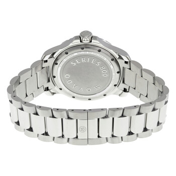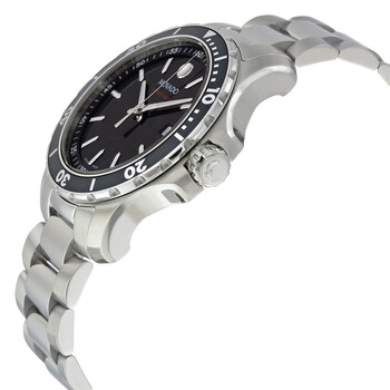 Stainless steel case with a stainless steel bracelet. Uni-directional rotating stainless steel bezel with a black aluminum ring. Black dial with luminous silver-tone hands and index hour markers. Arabic numeral minute markers (at 5 minute intervals). Minute markers around the outer rim. The Movado dot appears at the 12 o'clock position. Dial Type: Analog. Luminescent hands and markers. Date display at the 3 o'clock position. Quartz movement. Scratch resistant sapphire crystal. Screw down crown. Solid case back. Round case shape. Case size: 40 mm. Case thickness: 11 mm. Band width: 20 mm. Fold over clasp. Water resistant at 200 meters / 660 feet. Functions: date, hour, minute, second. Series 800 Series. Sport watch style. Watch label: Swiss Made. Movado Series 800 Black Dial Stainless Steel Men's Watch 2600135.