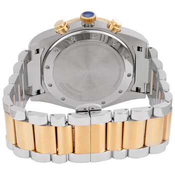 Stainless steel case with a two-tone (silver-tone and gold-tone) stainless steel bracelet. Uni-directional rotating gold-tone bezel. Black dial with luminous gold-tone hands and index hour markers. Minute markers around the outer rim. Dial Type: Analog. Luminescent hands and markers. Date display at the 4 o'clock position. Chronograph - three silver sub-dials displaying: 60 second, 30 minute and 1/10th of a second. Quartz movement. Scratch resistant sapphire crystal. Pull / push crown. Solid case back. Round case shape. Case size: 41 mm. Case thickness: 10 mm. Fold over clasp with a push button release. Water resistant at 30 meters / 100 feet. Functions: date, hour, minute, second. Sport Series. Sport watch style. Watch label: Swiss Made. Movado Sport Chronograph Quartz Black Dial Men's Watch 0607441.