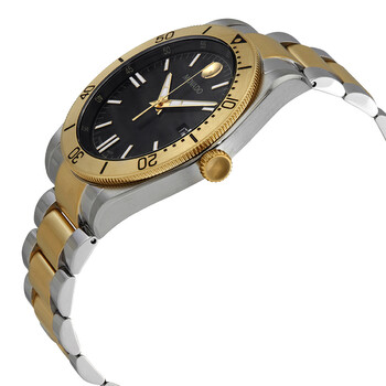 Stainless steel case with a two-tone (silver-tone and gold-tone) stainless steel bracelet. Uni-directional rotating gold-tone stainless steel bezel. Black dial with luminous gold-tone hands and index hour markers. Minute markers. Arabic numeral minute markers (at 5 minute intervals) around the outer rim. The Movado dot appears at the 12 o'clock position. Dial Type: Analog. Luminescent hands and markers. Date display at the 3 o'clock position. Quartz movement. Scratch resistant sapphire crystal. Pull / push crown. Solid case back. Round case shape. Case size: 41 mm. Case thickness: 9 mm. Band width: 21 mm. Fold over clasp with a push button release. Water resistant at 30 meters / 100 feet. Functions: date, hour, minute, second. Sport Series. Casual watch style. Watch label: Swiss Made. Movado Sport Quartz Black Dial Two-tone Men's Watch 0607437.