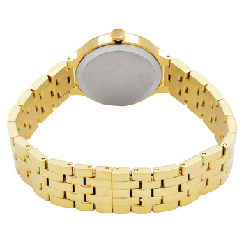 Yellow gold PVD stainless steel case and bracelet. Fixed yellow gold PVD stainless steel bezel. Black dial with gold-tone hands. Dial Type: Analog. Quartz movement. Scratch resistant sapphire crystal. Pull / push crown. Solid case back. Round case shape, case size: 28 mm. Deployment clasp. Water resistant at 30 meters / 100 feet. Functions: hour, minute. Veturi Series. Casual watch style. Watch label: Swiss Made. Movado Veturi Quartz Black Dial Ladies Watch 0608046.