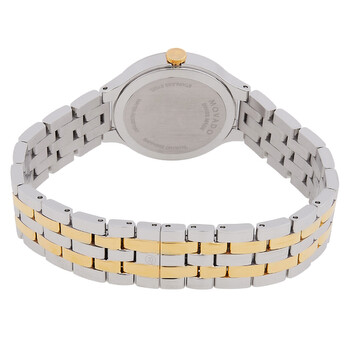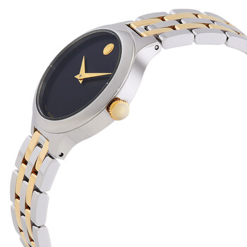 Silver-tone stainless steel case with a two-tone (silver-tone and yellow gold-tone) stainless steel bracelet. Fixed silver-tone stainless steel bezel. Black dial with gold-tone hands. Dial Type: Analog. Quartz movement. Scratch resistant sapphire crystal. Pull / push crown. Solid case back. Round case shape, case size: 28 mm. Deployment clasp. Functions: hour, minute. Veturi Series. Casual watch style. Watch label: Swiss Made. Movado Veturi Quartz Black Dial Ladies Watch 0608045.