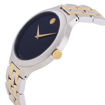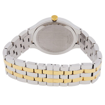 Silver-tone stainless steel case with a two-tone (silver-tone and yellow gold-tone) stainless steel bracelet. Fixed silver-tone stainless steel bezel. Black dial with gold-tone hands. Dial Type: Analog. Quartz movement. Scratch resistant sapphire crystal. Pull / push crown. Solid case back. Round case shape, case size: 40 mm. Deployment clasp. Functions: hour, minute. Veturi Series. Casual watch style. Watch label: Swiss Made. Movado Veturi Quartz Black Dial Men's Watch 0608042.