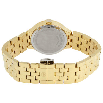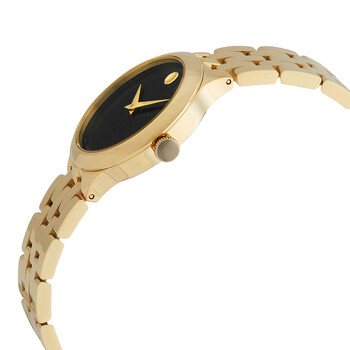 Yellow gold PVD stainless steel case and bracelet. Fixed yellow gold PVD stainless steel bezel. Black museum dial with gold-tone hands. No markers. Movado dot appears at the 12 o'clock position. Dial Type: Analog. Quartz movement. Scratch resistant sapphire crystal. Pull / push crown. Solid case back. Round case shape, case size: 28 mm. Deployment with push button release clasp. Water resistant at 30 meters / 100 feet. Functions: hour, minute. Veturi Series. Dress watch style. Watch label: Swiss Made. Movado Veturi Quartz Black Museum Dial Ladies Watch 0607420.