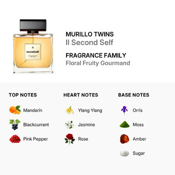 Step into your power with Murillo Twins' II Second Self, a captivating ladies' fragrance that celebrates confidence and elegance. This floral fruity gourmand scent opens with a burst of bright mandarin, juicy blackcurrant, and a touch of pink pepper for a fresh yet spicy first impression. It’s the perfect way to start your day feeling bold and beautiful.