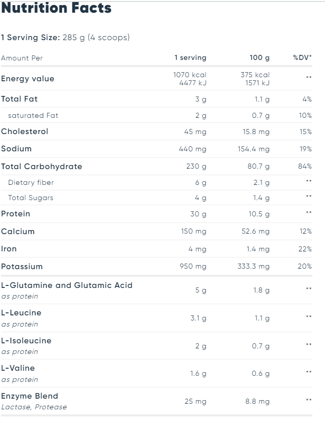 თითოეული პორცია იძლევა 1270 კალორიას, 46 გრამ ცილას, 255 გრამ ნახშირწყლებს და 7,5 გრამ ჯანსაღ ცხიმს, როდესაც შერეულია მხოლოდ ორი ჭიქა 1% რძესთან. პროდუქტი დამზადებულია ბუნებრივი საკვებით და ბუნებრივად შეიცავს BCAA-ს, EAA-ს, გლუტამინს და სხვა ამინომჟავებს, რომლებიც საჭიროა მძიმე ვარჯიშის დროს კუნთების ზრდისთვის.