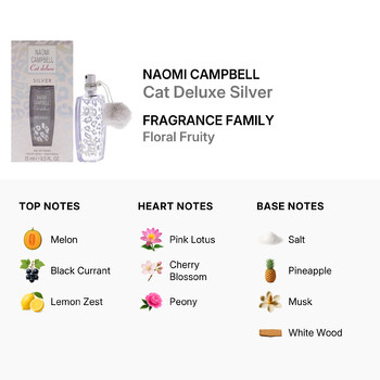 At first spritz, Cat Deluxe Silver opens with bright top notes of juicy melon, zesty lemon peel, and sweet black currant. These fresh, fruity notes awaken the senses and set the stage for the heart of the fragrance. Delicate floral tones of pink lotus, cherry blossom, and peony bloom at the center, creating a graceful and feminine aroma that’s both soft and uplifting.