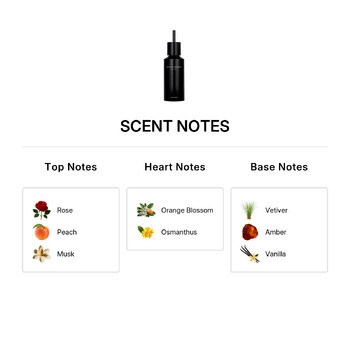 At the first spritz, you'll be greeted by delicate top notes of rose, peach, and warm musk. These luscious aromas create a gentle and inviting introduction. As the fragrance unfolds, heart notes of orange blossom and osmanthus bloom, adding a radiant floral touch that feels both classic and modern. Finally, a rich base of vetiver, amber, and creamy vanilla creates a smooth, sensual finish that lingers beautifully on the skin.