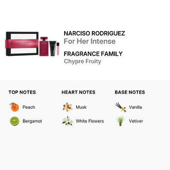 Discover the bold elegance of Narciso Rodriguez For Her Intense, a luxurious ladies’ fragrance gift set launched in 2025. This captivating scent belongs to the Chypre Fruity family, blending vibrant top notes of juicy peach and fresh bergamot with a heart of sensual musk and soft white flowers. The fragrance settles into a warm, lasting base of creamy vanilla and earthy vetiver, creating a sophisticated signature scent that feels both modern and timeless.