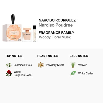 Narciso Poudree opens with the radiant freshness of jasmine petals and white Bulgarian rose, creating a light and graceful introduction. At its heart, a signature powdery musk brings warmth and sensuality, wrapping you in a velvety embrace. The base notes of vetiver and white cedar add depth and earthiness, grounding the fragrance in timeless beauty.
