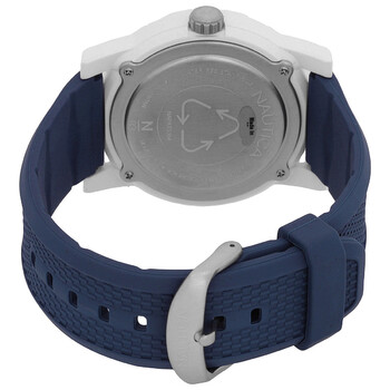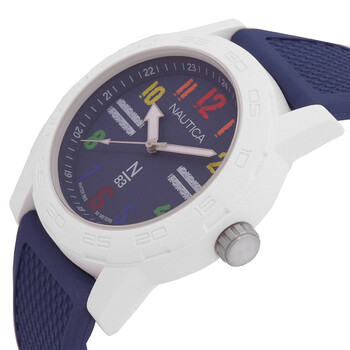 Silver-tone bio-ceramic case with a blue polyurethane strap. Fixed silver-tone bio-ceramic bezel. Blue dial with silver-tone hands and Arabic numeral hour markers. Minute markers around the outer rim. Dial Type: Analog. Luminescent hands and markers. Quartz movement. Scratch resistant mineral crystal. Solid case back. Round case shape, case size: 44 mm. Band width: 24 mm. Buckle clasp. Water resistant at 50 meters / 165 feet. Functions: hour, minute, second. Ayia Triada Series. Casual watch style. Watch label: Japan Movt. Nautica Ayia Triada Blue Dial Men's Watch NAPATS304.