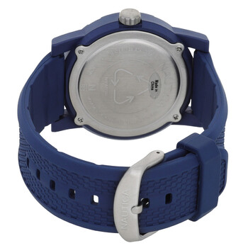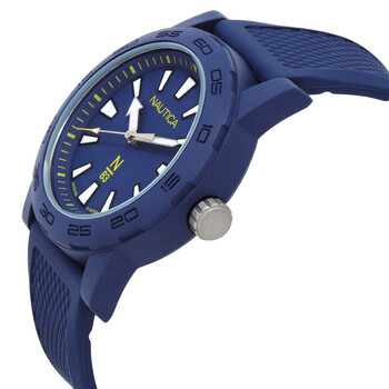 Blue bio-ceramic case with a blue wheat fiber band. Fixed blue bezel. Blue dial with silver-tone hands and index hour markers. Minute markers around the outer rim. Dial Type: Analog. Quartz movement. Scratch resistant mineral crystal. Pull / push crown. Solid case back. Round case shape, case size: 44 mm, case thickness: 11 mm. Buckle clasp. Water resistant at 50 meters / 165 feet. Functions: hour, minute, second. Ayia Triada Series. Casual watch style. Watch label: Japan Movt. Nautica Ayia Triada Quartz Blue Dial Men's Watch NAPATF202.