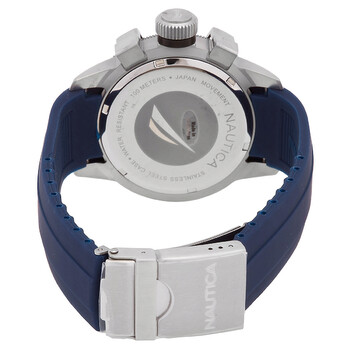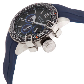 Silver-tone stainless steel case with a blue silicone strap. Fixed black stainless steel bezel. Black dial with silver-tone hands and index-Arabic numeral hour markers. Minute markers around the outer rim. Dial Type: Analog. Date display between 4 and 5 o'clock position. Chronograph - three sub-dials displaying: 60 second, 60 minute and 24 hour. Quartz movement. Scratch resistant mineral crystal. Solid case back. Round case shape, case size: 46 mm. Buckle clasp. Water resistant at 100 meters / 330 feet. Functions: chronograph, date, hour, minute, second. Bfc Series. Sport watch style. Nautica BFC Chronograph Quartz Black Dial Men's Watch NAPBFF101.