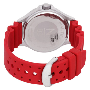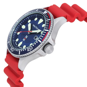 Silver-tone stainless steel case with a red wheat fiber band. Fixed black stainless steel bezel. Blue dial with silver-tone hands and dots hour markers. Minute markers around the outer rim. Dial Type: Analog. Luminescent hands and markers. Date display at the 3 o'clock position. Eco-drive movement. Scratch resistant mineral crystal. Pull / push crown. Solid case back. Round case shape, case size: 43 mm, case thickness: 12 mm. Tang clasp. Water resistant at 50 meters / 165 feet. Functions: date, hour, minute, second. Cocoa Beach Series. Casual watch style. Watch label: Japan Movt. Nautica Cocoa Beach Blue Dial Men's Watch NAPCBS301.