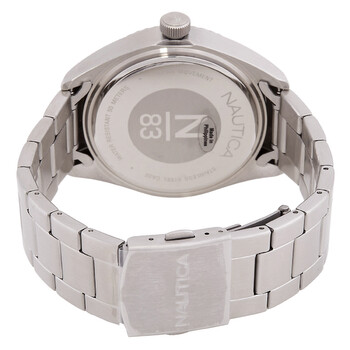 Silver-tone stainless steel case and bracelet. Fixed silver-tone stainless steel bezel. Black dial with black hands and index-Arabic numeral hour markers. Dial Type: Analog. Quartz movement. Scratch resistant mineral crystal. Pull / push crown. Solid case back. Round case shape, case size: 45 mm, case thickness: 14 mm. Band width: 22 mm. Deployment with push button release clasp. Water resistant at 50 meters / 165 feet. Functions: hour, minute, second. Finn World Series. Casual watch style. Watch label: Japan Movt. Nautica Finn World Black Dial Men's Watch NAPFWS306.