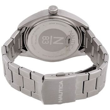 Silver-tone stainless steel case and bracelet. Fixed black and white stainless steel bezel. Black dial with silver-tone hands and index hour markers. Minute markers around the outer rim. Dial Type: Analog. Luminescent hands and markers. Quartz movement. Scratch resistant mineral crystal. Pull / push crown. Solid case back. Round case shape, case size: 44 mm. Fold over clasp with a safety release. Water resistant at 50 meters / 165 feet. Functions: hour, minute, second. Finn World Series. Casual watch style. Nautica Finn World Quartz Black Dial Men's Watch NAPFWF309.