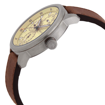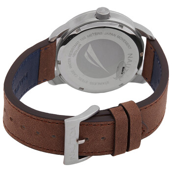 Silver-tone stainless steel case with a brown leather strap. Fixed silver-tone stainless steel bezel. Beige dial with black hands and index hour markers. Minute markers around the outer rim. Dial Type: Analog. Three sub-dials displaying: date, day and 24 houe. Quartz movement. Scratch resistant mineral crystal. Solid case back. Round case shape, case size: 44 mm, case thickness: 13 mm. Buckle clasp. Water resistant at 100 meters / 330 feet. Functions: date, day, hour, minute, second. Forbell Series. Sport watch style. Nautica Forbell Multifunction Quartz Men's Watch NAPFRL001.