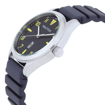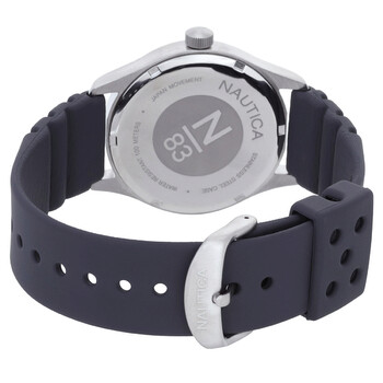 Silver-tone stainless steel case with a blue pu fiber band. Fixed silver-tone stainless steel bezel. Blue dial with silver-tone hands. Minute markers around the outer rim. Dial Type: Analog. Quartz movement. Scratch resistant mineral crystal. Solid case back. Round case shape, case size: 42 mm. Buckle clasp. Water resistant at 100 meters / 330 feet. Functions: hour, minute, second. Hannay Bay Series. Sport watch style. Nautica Hannay Bay Quartz Blue Dial Men's Watch NAPHBS404.