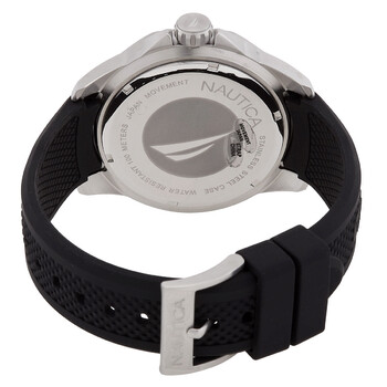 Silver-tone stainless steel case with a black silicone strap. Fixed black stainless steel bezel. Black dial with silver-tone hands and index-Arabic numeral hour markers. Minute markers around the outer rim. Dial Type: Analog. Luminescent hands and markers. Quartz movement. Scratch resistant mineral crystal. Solid case back. Octagonal case shape, case size: 46 mm. Buckle clasp. Water resistant at 100 meters / 330 feet. Functions: hour, minute, second. Koh May Bay Series. Sport watch style. Nautica Koh May Bay Quartz Black Dial Men's Watch NAPKMF305.