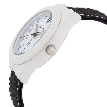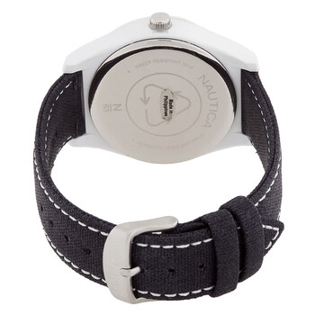 White ocean plastic case with a blue canvas strap. Fixed white ocean plastic bezel. White dial with black hands and index-Arabic numeral hour markers. Minute scale around the inner rim. Dial Type: Analog. Luminescent hands. Quartz movement. Scratch resistant mineral crystal. Solid case back. Round case shape, case size: 41 mm, case thickness: 12 mm. Band width: 20 mm. Buckle clasp. Water resistant at 50 meters / 165 feet. Functions: hour, minute, second. N83 Everyday Series. Sport watch style. Watch label: Japan Movt. Nautica N83 Everyday Quartz White Dial Men's Watch NAPMBF203.
