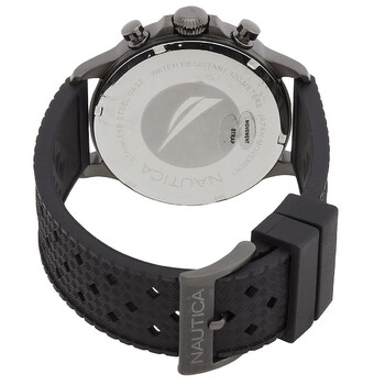 Gunmetal stainless steel case with a black rubber strap. No bezel bezel. Grey dial with gunmetal hands and Arabic numeral hour markers. Minute markers around the outer rim. Dial Type: Analog. Luminescent hands and markers. Date display between 4 and 5 o'clock position. Chronograph - three sub-dials displaying: 60 second, 60 minute and 24 hours. Quartz movement. Scratch resistant mineral crystal. Solid case back. Round case shape, case size: 45 mm, case thickness: 12.4 mm. Band width: 22 mm. Tang clasp. Water resistant at 100 meters / 330 feet. Functions: chronograph, date, hour, minute, second. Nct Blue Ocean Series. Dress watch style. Nautica NCT Blue Ocean Chronograph Quartz Grey Dial Men's Watch NAPBOS401.
