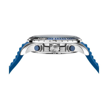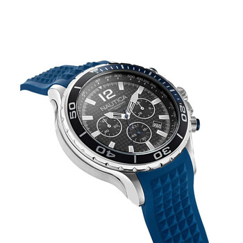 Silver-tone stainless steel case with a blue silicone strap. Black and blue stainless steel bezel. Black dial with silver-tone hands and index-Arabic numeral hour markers. Minute markers around the outer rim. Dial Type: Analog. Date display between 4 and 5 o'clock position. Chronograph - three sub-dials displaying: 60 second, 60 minute and 24 hour. Quartz movement. Scratch resistant mineral crystal. Solid case back. Round case shape, case size: 49 mm, case thickness: 13 mm. Band width: 22 mm. Buckle clasp. Water resistant at 100 meters / 330 feet. Functions: chronograph, date, hour, minute, second. Nst Series. Casual watch style. Watch label: Japan Movt. Nautica Nst Chronograph Quartz Black Dial Men's Watch NAPNSTF05.