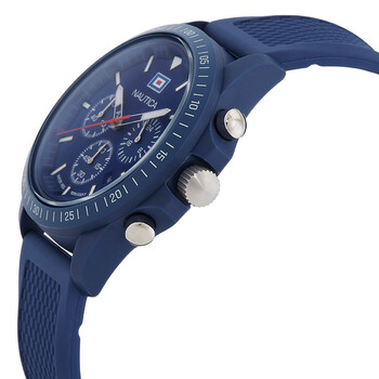 Blue ceramic case with a blue pu fiber band. Fixed blue ceramic bezel. Blue dial with silver-tone hands and index hour markers. Minute markers around the outer rim. Dial Type: Analog. Luminescent hands and markers. Date display between 4 and 5 o'clock position. Chronograph - three sub-dials displaying: 60 second, 60 minute and 24 hour. Quartz movement. Scratch resistant mineral crystal. Solid case back. Round case shape, case size: 43 mm. Buckle clasp. Water resistant at 100 meters / 330 feet. Functions: chronograph, date, hour, minute, second. Nautica One Series. Casual watch style. Nautica One Chronograph Quartz Blue Dial Men's Watch NAPNOF3S7.