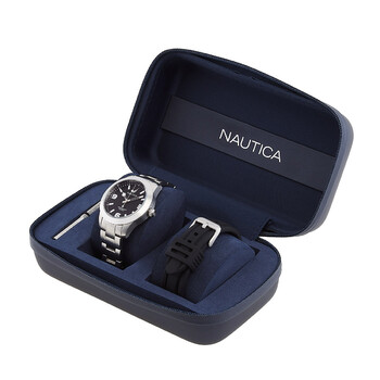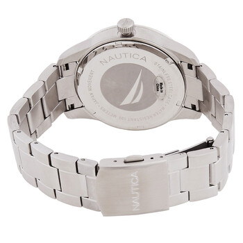 Silver-tone stainless steel case and bracelet. Fixed silver-tone stainless steel bezel. Black dial with silver-tone hands and index-Arabic numeral hour markers. Minute markers around the outer rim. Dial Type: Analog. Quartz movement. Scratch resistant mineral crystal. Solid case back. Round case shape, case size: 42 mm. Fold over clasp with a safety release. Water resistant at 100 meters / 330 feet. Functions: hour, minute, second. Pacific Beach Series. Casual watch style. Nautica Pacific Beach Quartz Black Dial Men's Watch NAPPBF205.