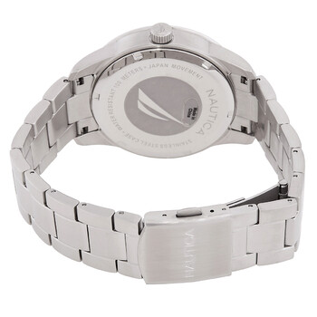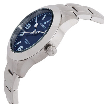 Silver-tone stainless steel case and bracelet. Fixed silver-tone stainless steel bezel. Blue dial with silver-tone hands and index-Arabic numeral hour markers. Minute markers around the outer rim. Dial Type: Analog. Quartz movement. Scratch resistant mineral crystal. Solid case back. Round case shape, case size: 42 mm. Fold over clasp with a safety release. Water resistant at 100 meters / 330 feet. Functions: hour, minute, second. Pacific Beach Series. Casual watch style. Nautica Pacific Beach Quartz Blue Dial Men's Watch NAPPBF201.