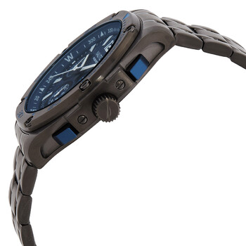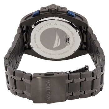 Gunmetal stainless steel case and bracelet. Fixed gunmetal stainless steel bezel. Blue dial with index-Arabic numeral hour markers. Minute markers around the outer rim. Dial Type: Analog. Luminescent hands and markers. Date display between 4 and 5 o'clock position. Chronograph - three sub-dials displaying: 60 second, 30 minute and 24 hour. Quartz movement. Scratch resistant mineral crystal. Solid case back. Tonneau case shape, case size: 44 mm, case thickness: 11 mm. Band width: 22 mm. Fold over clasp with a safety release. Water resistant at 100 meters / 330 feet. Functions: chronograph, date, hour, minute, second. Tin Can Bay Series. Sport watch style. Watch label: Japan Movt. Nautica Tin Can Bay Blue Dial Men's Watch NAPTCF211.