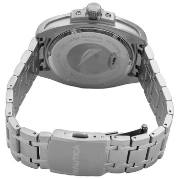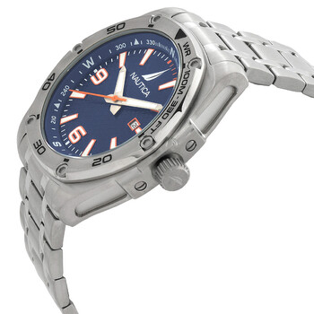 Silver-tone stainless steel case and bracelet. Fixed silver-tone stainless steel bezel. Blue dial with silver-tone hands and index-Arabic numeral hour markers. Minute markers around the outer rim. Dial Type: Analog. Luminescent hands and markers. Date display at the 3 o'clock position. Quartz movement. Scratch resistant mineral crystal. Solid case back. Round case shape, case size: 44 mm. Fold over clasp with a safety release. Water resistant at 100 meters / 330 feet. Functions: date, hour, minute, second. Tin Can Bay Series. Casual watch style. Nautica Tin Can Bay Quartz Blue Dial Men's Watch NAPTCF203.